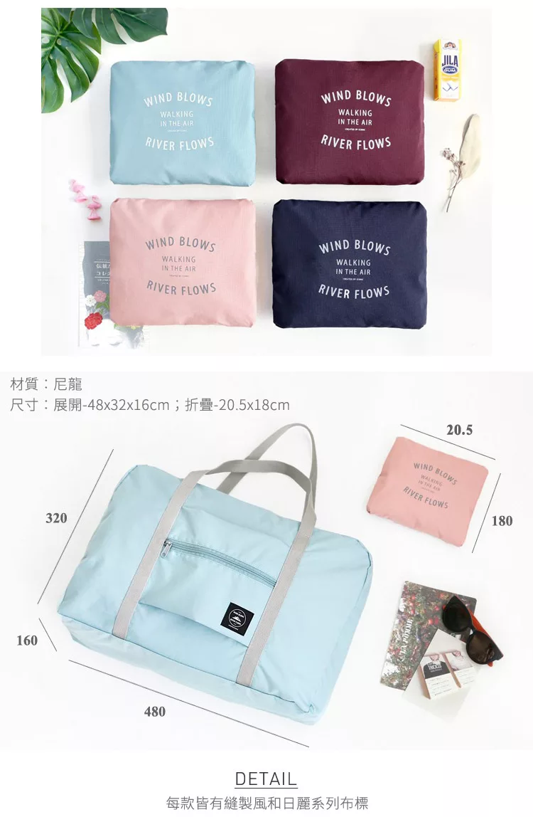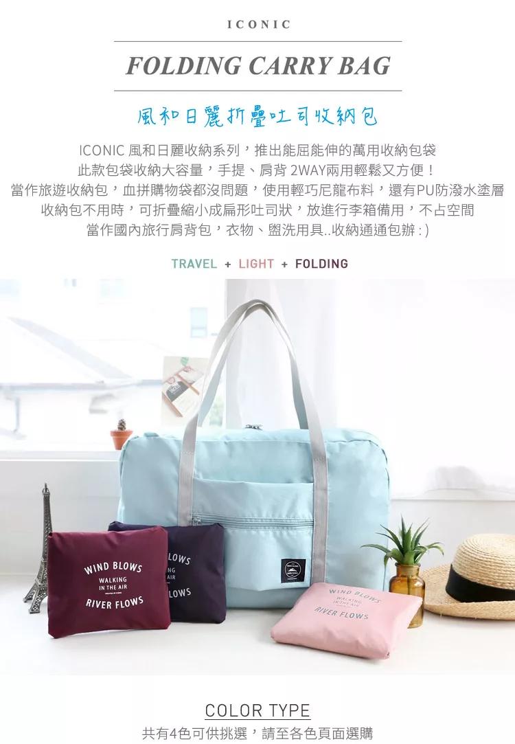 收納包袋折疊收起時,可看見風和日麗系列文字印刷。